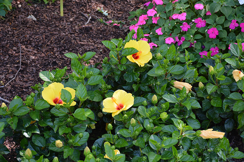 Sunny Wind Hibiscus features bold yellow round flowers with red eyes at the ends of the branches from mid summer to early fall. Its glossy pointy leaves remain dark green in color throughout the year.